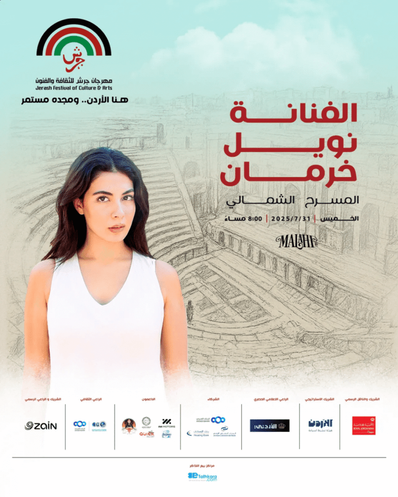 تطل الفنانة الفلسطينية نويل خرمان على جمهور مهرجان جرش للثقافة والفنون في أمسية مميزة تقام على المسرح الشمالي، مساء الخميس الموافق 31 تموز 2025، في تمام الساعة الثامنة.وتقدّم خرمان خلال الحفل مجموعة من أغانيها الخاصة التي تجمع بين الطابع العربي المعاصر والنفَس الغر