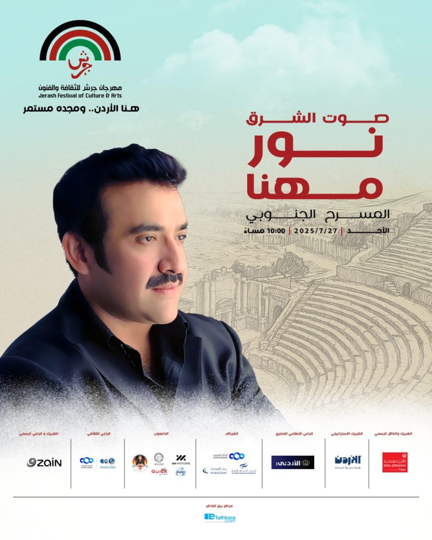 من حلب إلى قرطاج، ومن ليالي “ليلة الزمن الجميل” إلى قلب جرش التاريخي…يأتي نور مهنا ليجدد عهداً مع الطرب الأصيل، بصوته القوي ونفَسه العميق، في سهرة لا تُنسى على خشبة المسرح الجنوبي.الساعة: 10:00التاريخ: 27/7