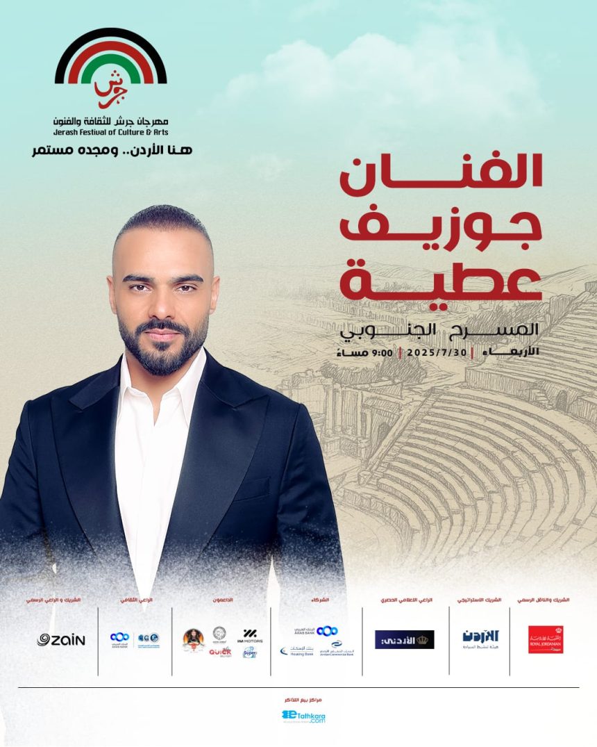 … صوت بيروت يصدح في سماء الأردن!بكلمات الحب وبصوت و إحساس، يطل علينا النجم اللبناني جوزيف عطية على المسرح الجنوبي في ليلة كلها نبض، موسيقى، وتفاعل حي من القلب.من “لا تروحي” لـ “حب ومكتر”… ومن “لو غمرني حدا” لـ “ألف مرّة”… جوزيف بيغني للحب والفرح، للشوق واللهفة، للناس اللي بتحب تعيش اللحظة.الساعة: 9:00التاريخ: 30/7
